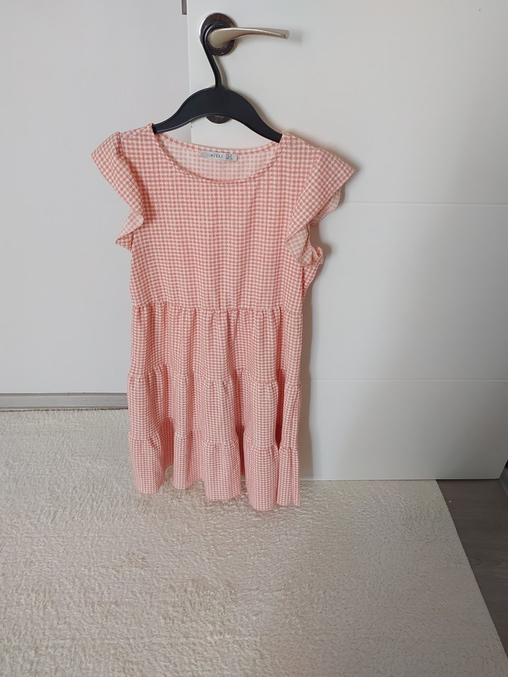 Kız çocukları için kısa kollu, fırfırlı ve rahat kesimli pembe elbise. Sentetik yumuşak dokulu kumaştan, sokak stiline uygun pastel tonlarda.
