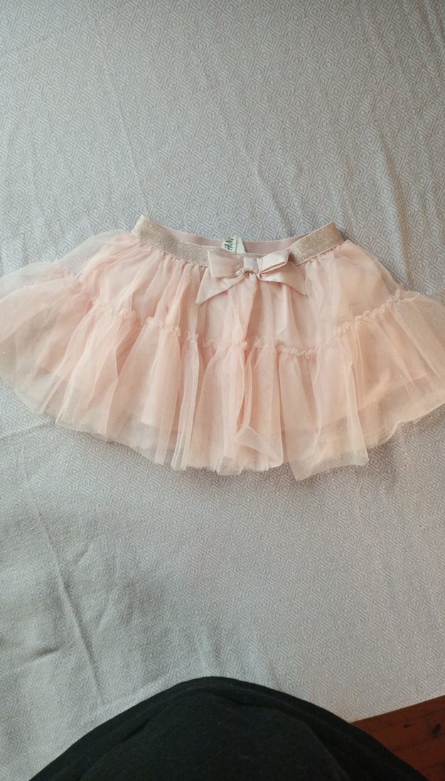 Pembe pastel renkte, belinde fiyonk detaylı, yumuşak sentetik kumaştan yapılmış kız çocuk için fitted kesim fırfırlı etek.