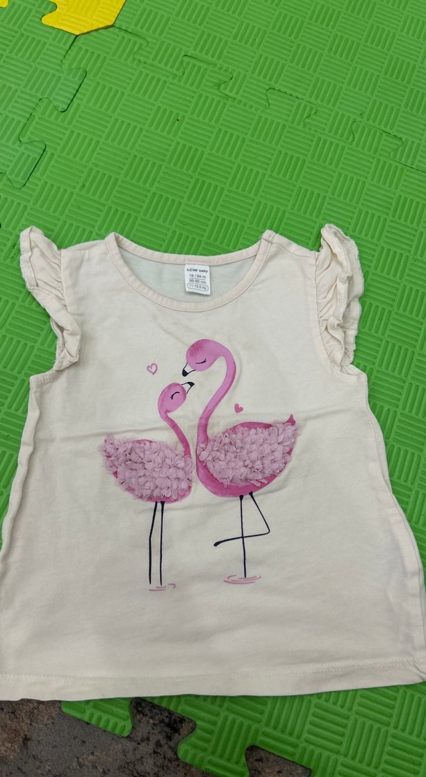 Omuzlarında fırfır detaylı, pembe renkli kız çocuk tişörtü. Ön kısmında renkli flamingo baskısı bulunur. Yumuşak sentetik kumaştan yapılmıştır.