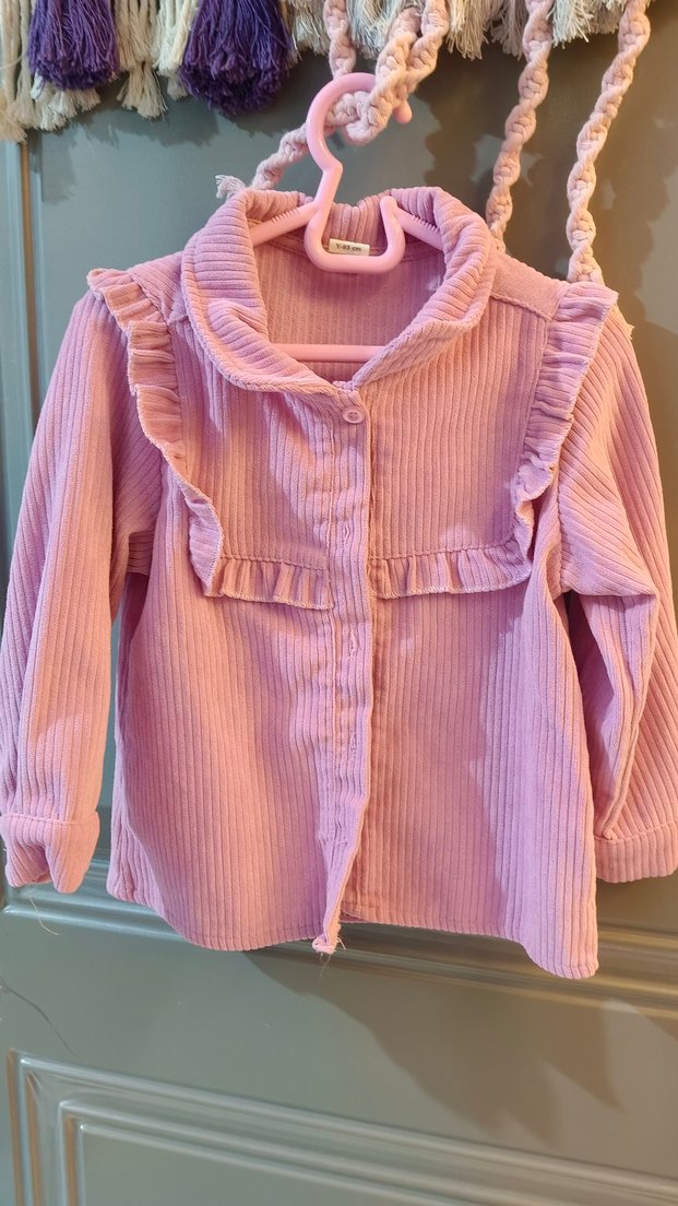 Pembe keten kumaştan, uzun kollu, yakalı ve fırfırlı detaylı kız çocuk gömleği. Rahat kesimi ve pastel tonu ile gündelik stil için uygundur.