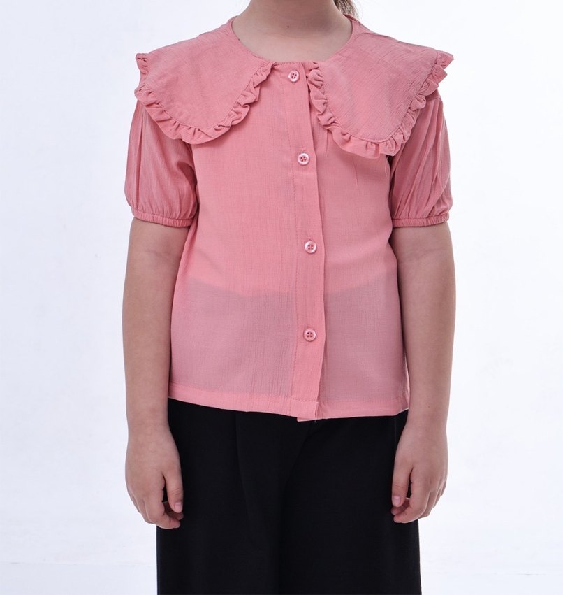Bol kesim, pembe pastel renkte kız çocuk gömleği, büyük fırfırlı yaka ve kısa kolludur. Düğmeli ön kapamalı ve yumuşak sentetik kumaştandır.