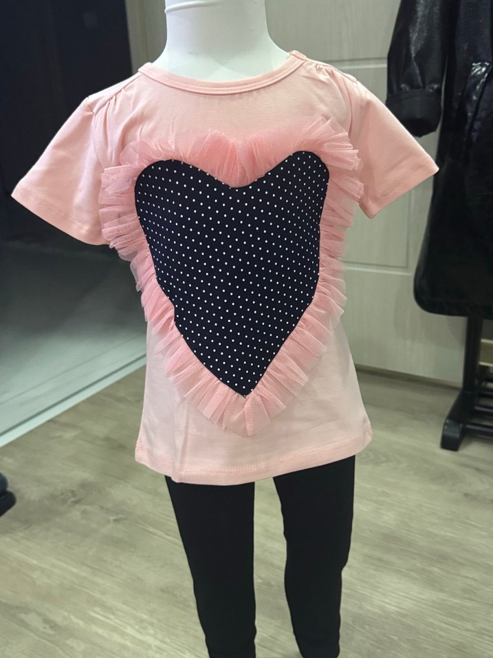 Pastel pembe renkli, kısa kollu ve bisiklet yakalı kız çocuk tişörtü. Siyah puantiyeli kalp baskısı ve pembe fırfır detayları bulunur. Sentetik kumaştan, trend sokak stili için uygun.