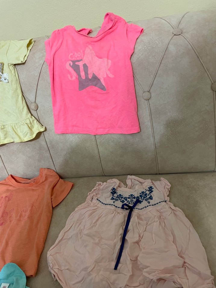 Pembe pastel renkte, straplez yaka, bol kesim, baskılı ve fırfır detaylı kısa kollu kız çocuk tişörtü. Toplu fiyatıdır (tekli alım fiyatı için sorun )