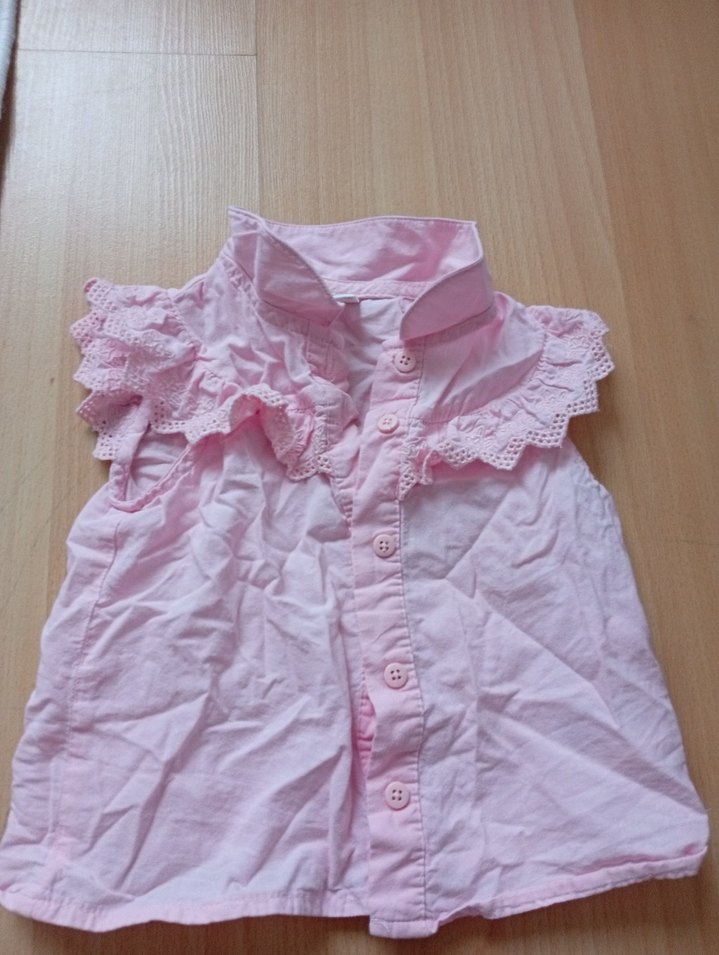 Kız çocuk için pamuklu, kolsuz, yakalı ve fırfırlı detaylara sahip pembe pastel renkte bol kesim bluz.