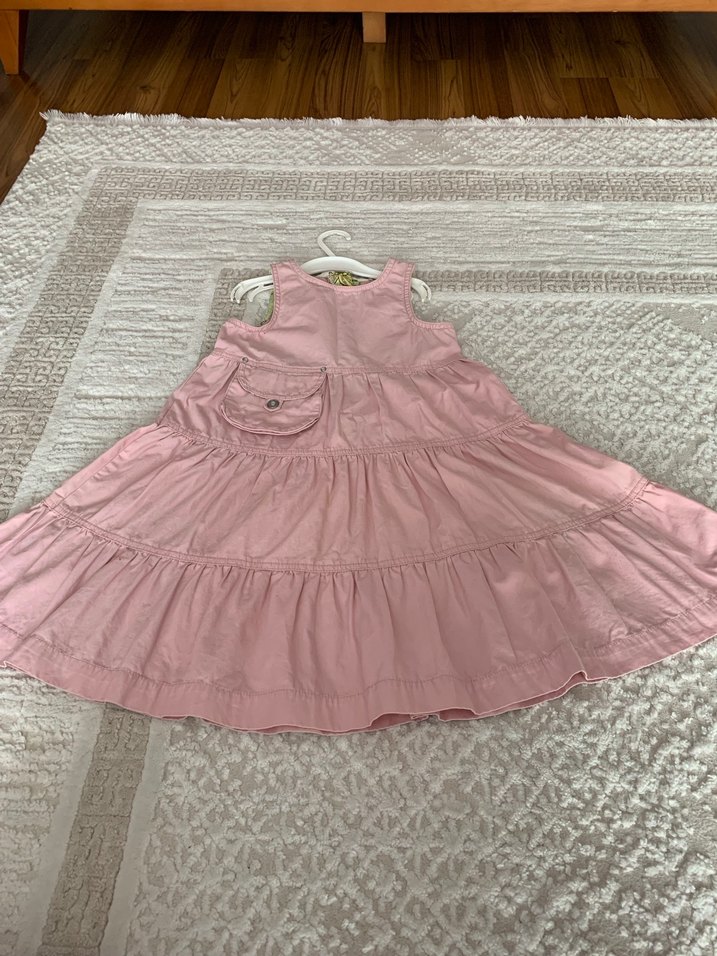Yumuşak keten kumaştan yapılmış, bol kesim, kolsuz pembe elbise. Fırfır detayları ve küçük cep özelliği bulunur. Hiç bir kusuru yok tertemiz