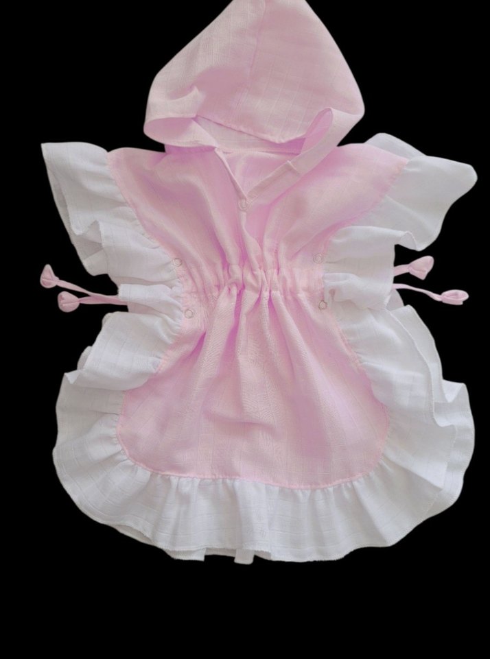 Yumuşak muslinkumaştan, bol kesim, pastel pembe renkli, fırfır detaylı ve kız çocuk panço. Kolsuz ve bohem tarz.