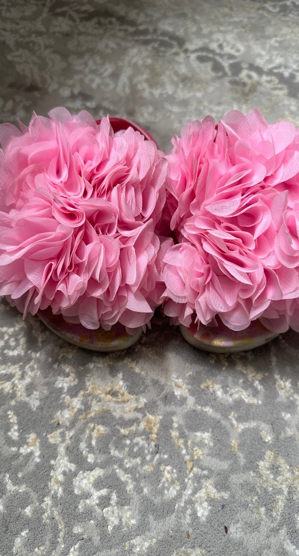 Kız çocukları için büyük pembe fırfırlara sahip, yumuşak sentetik kumaştan özel gün ayakkabısı. Bohem çiçek desenli tarzda.