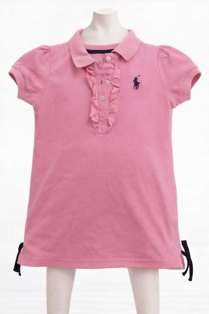 Kısa kollu, yakalı ve önünde fırfır detaylı, pembe tonlarında, baskılı logolu, yumuşak ve sıcak kumaştan yapılmış, dar kesim kız çocuk polo tişört.