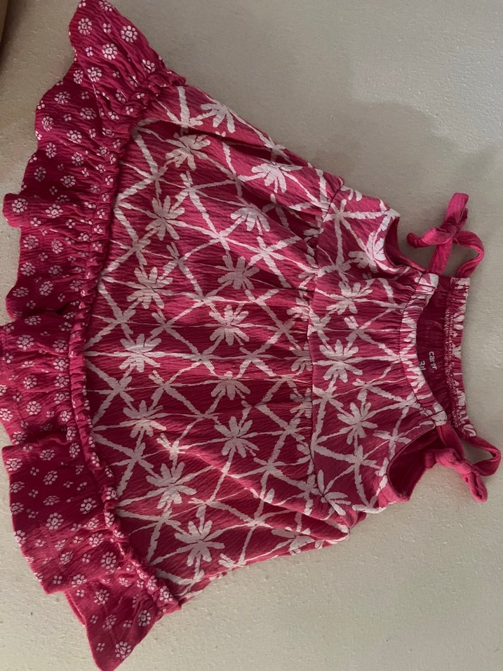 Renkli pembe elbise, bohem tarzda batik desenli, fırfırlı ve ayarlanabilir askılıdır. Salaş kesim ve straplez yakaya sahiptir.