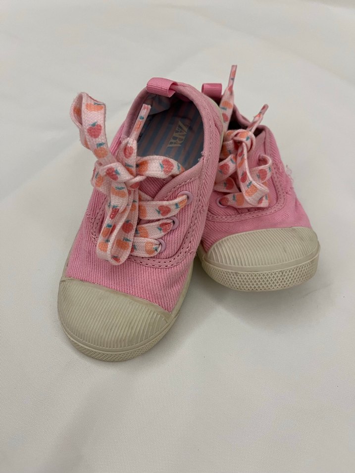Pastel pembe renkli, lastik tabanlı, bağcıkları fırfırlı ve batik desenli kız çocuk spor ayakkabısı.