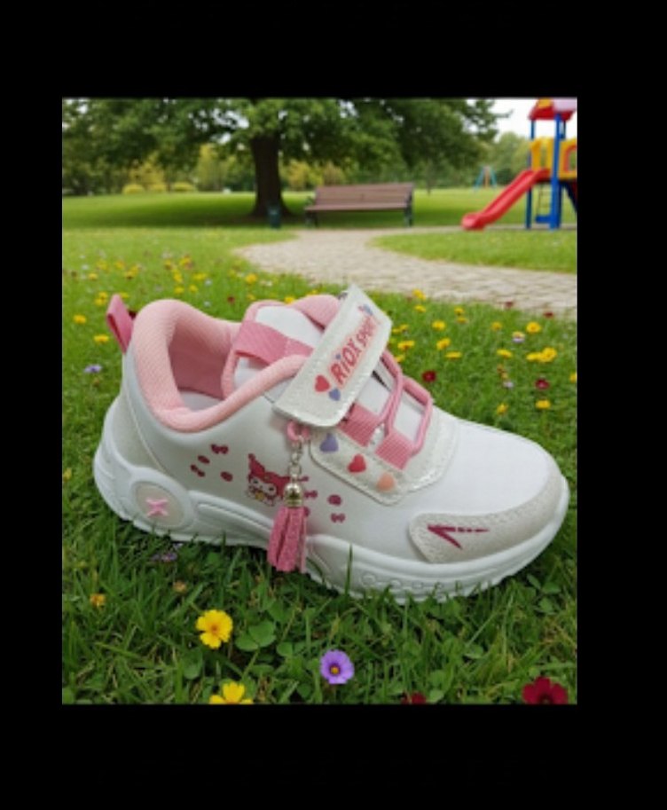 Kız çocuklar için renkli baskılı, pembe detaylı ve fırfırlı spor ayakkabılar. Kauçuk tabanlı, trend sokak stili için uygun.