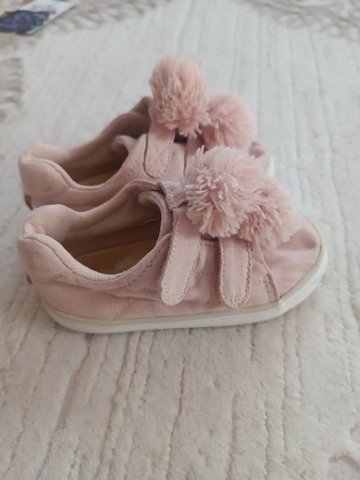 Yumuşak kürk dokusuna sahip pastel pembe kız çocuk spor ayakkabısı, fırfır ve ponpon detaylarıyla trendy casual tarzda.