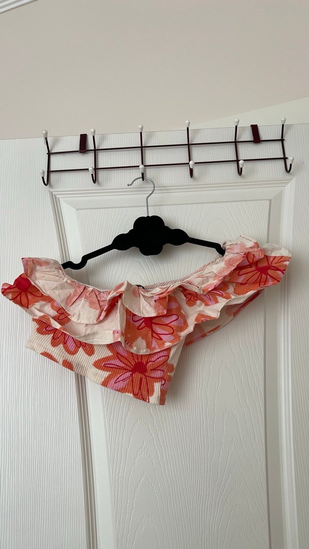 Kız çocukları için straplez yakalı, pembe tonlarında bağlama desenli, yumuşak tekstil kumaştan yapılmış, fırfırlı ve dar kesim bluz.