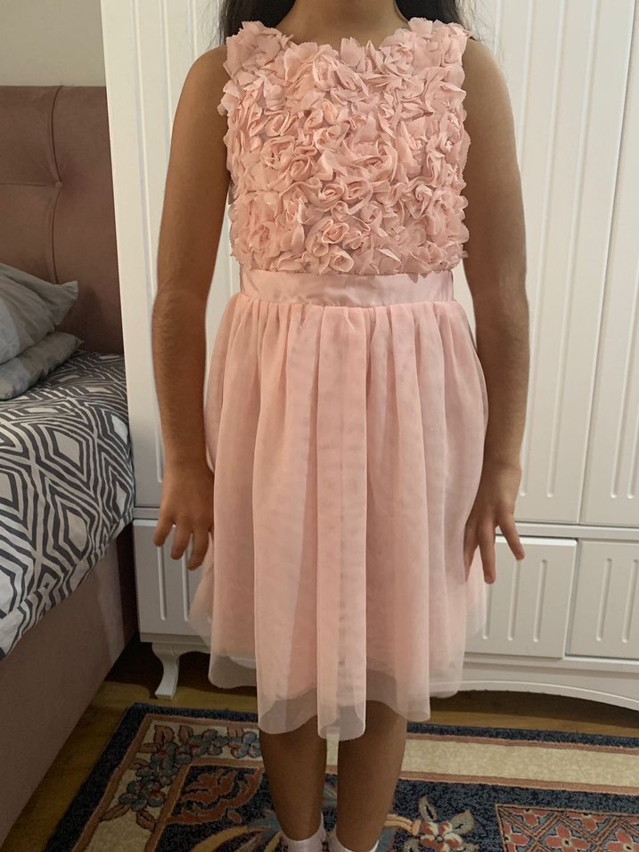 Kız çocukları için pastel tonlu, straplez yakalı, fırfır detaylı, kolsuz ve vücuda oturan pembe elbise. Yumuşak sentetik kumaştan üretilmiştir. bir kere kullanılmış ve defosuzdur.indirim için yazabilirsiniz