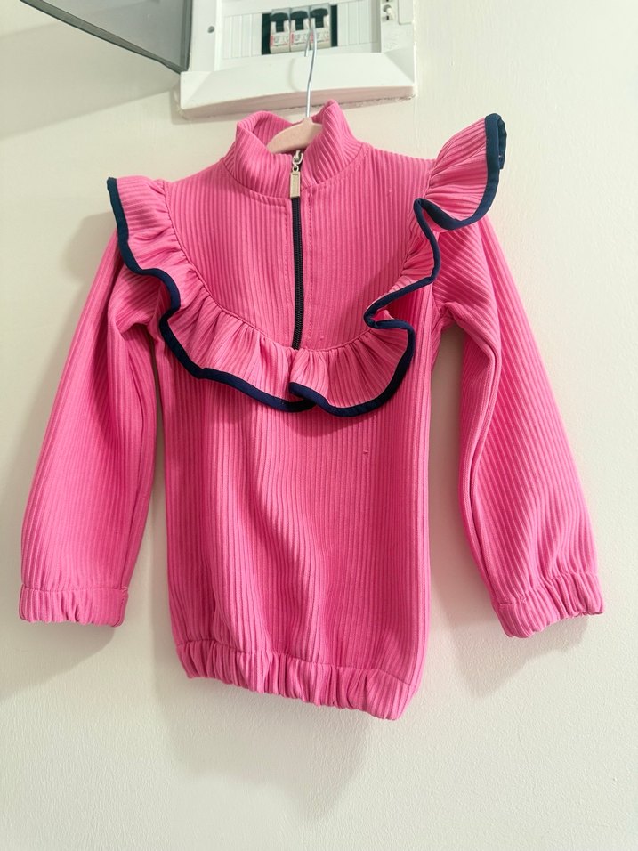Pembe renkli kız çocuk sweatshirt, yüksek yakalı, uzun kollu ve vücuda oturan kesime sahiptir. Renkli fırfır detayı ve yumuşak kumaşıyla dikkat çeker.