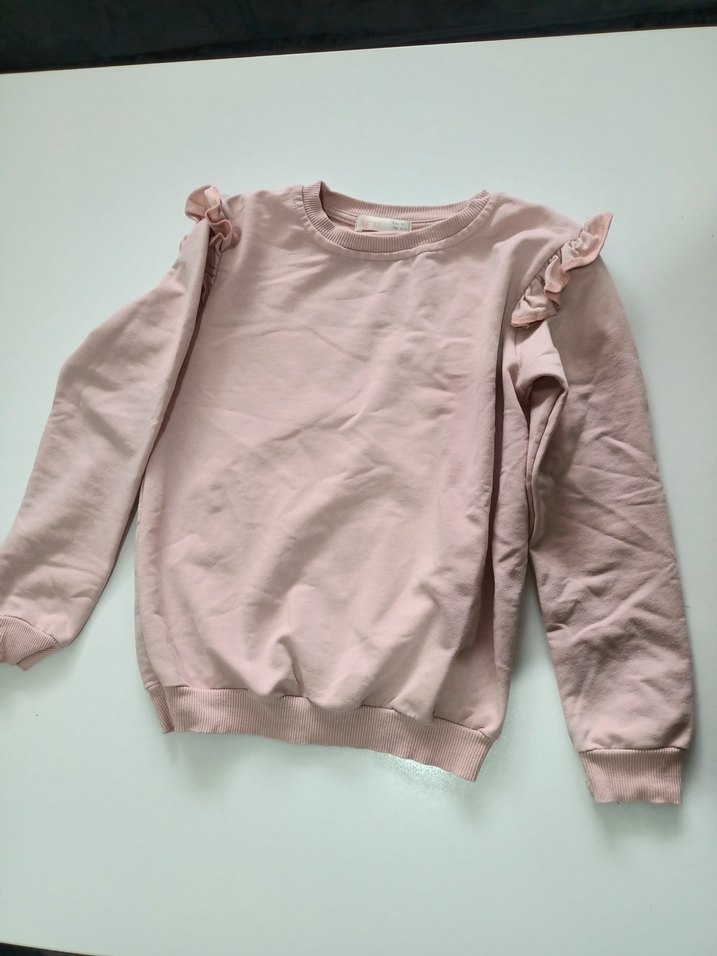 Uzun kollu, yuvarlak yaka ve omuzlarda fırfır detaylı bol kesim kız çocuk sweatshirtü. Yumuşak sentetik kumaştan, pastel pembe renkte, rahat sokak stili için uygundur.