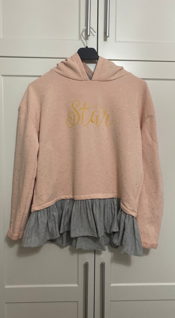 Pembe uzun kollu, bol kesim sweatshirt. Gri fırfırlı etek ucu ve önünde "Star" baskısı bulunur. Kapüşonlu ve yuvarlak yaka, yumuşak sentetik kumaş.