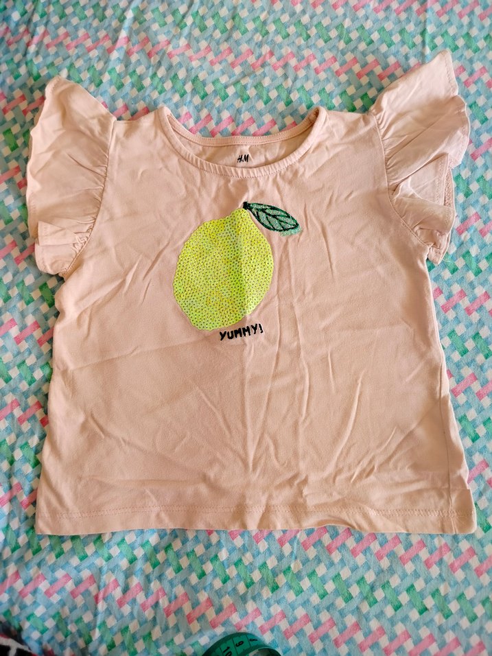 Kız çocuk pembe tişört, kısa fırfırlı kollu ve bol kesimdir. Önünde "YUMMY!" yazılı limon baskısı vardır. Yuvarlak yaka ve yumuşak sentetik kumaştan üretilmiştir.