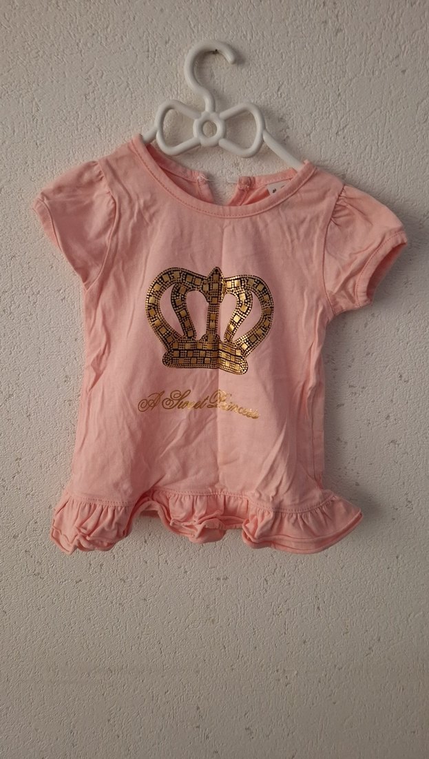 Kız çocukları için pembe, kısa kollu, fırfırlı ve parlak baskılı taç desenli tişört. Yuvarlak yaka ve fırfırlı etek ucu ile sentetik yumuşak kumaştan üretilmiştir. size 74 cm
