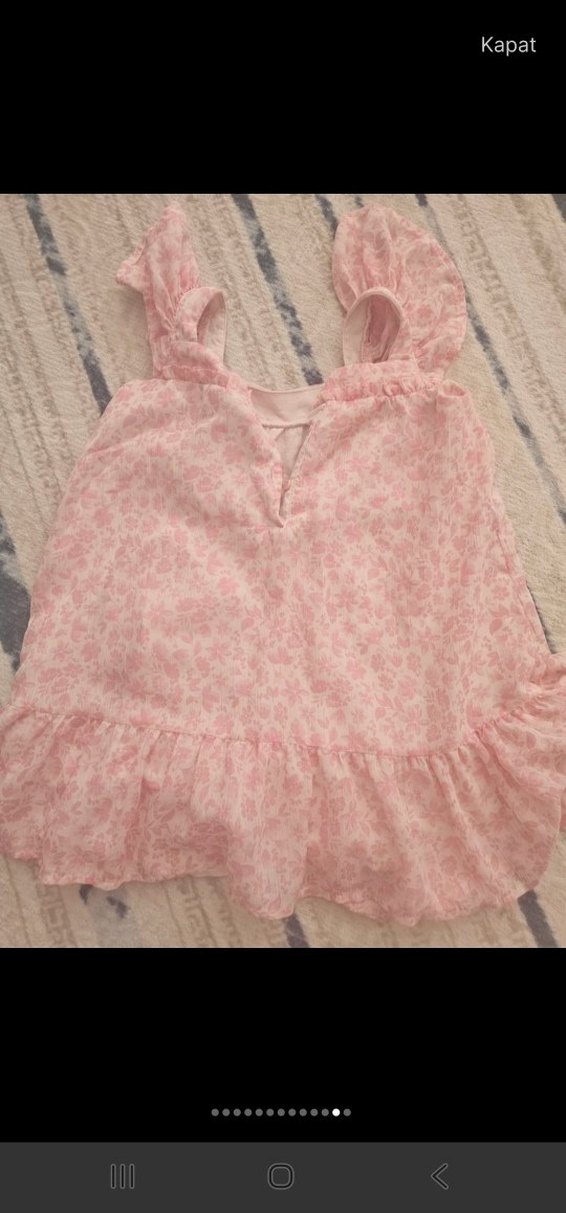 Pembe, kolsuz, fırfırlı ve V yaka bluz. Bol kesim, pastel tonlarda tie-dye desenli, yumuşak sentetik kumaştan yapılmıştır. Bohem tarzda.