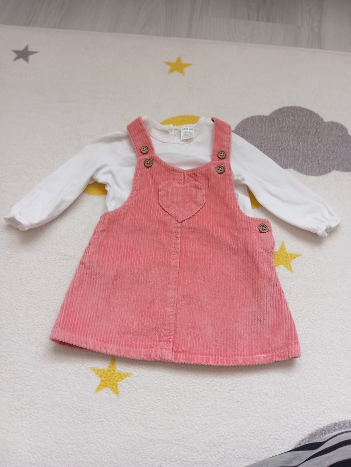Pamuklu, fitilli kadife kumaştan yapılmış, düğmeli, straplez yaka ve uzun kollu pembe kız çocuk elbisesi. Pastel tonlarda, trendi ve rahat bir tarz sunar.