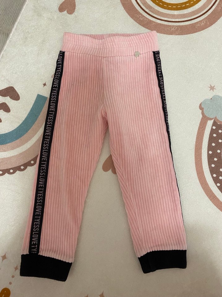 Kız çocukları için yumuşak ve sıcak kumaştan yapılmış pembe, fitilli kadife tayt. Lastikli bel ve yanlarda yazılı siyah şeritler bulunur. Rahat günlük giyim için uygundur.