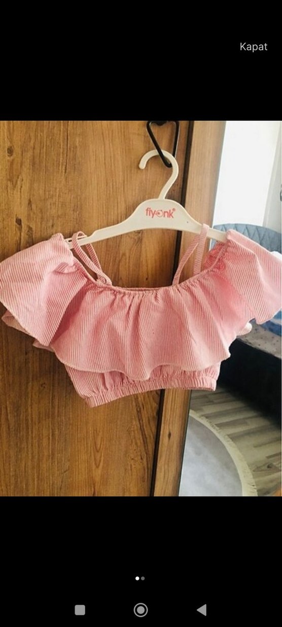Kız çocuklar için rütüşlü, askılı ve straplez yakalı pembe fiyonk bluz. Gevşek kesim ve pastel tonlarda, yumuşak sentetik kumaştan. 3-4 yas