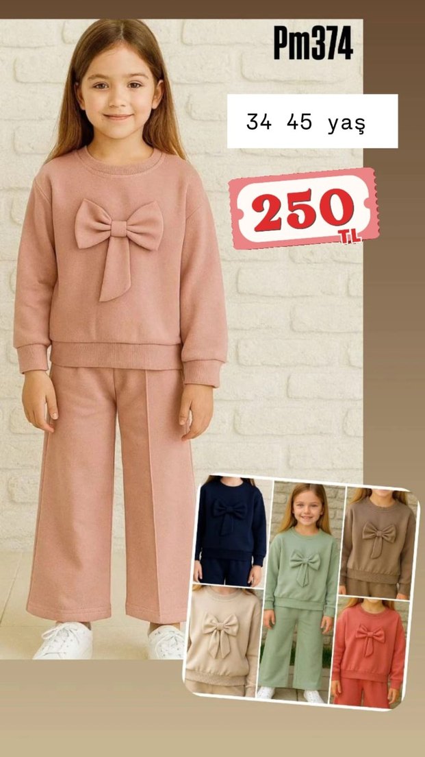 Kız çocuklar için pembe pastel renkte, yumuşak kumaşlı, fiyonk detaylı, uzun kollu ve bisiklet yaka eşofman takımı. Rahat kesim sunar.
