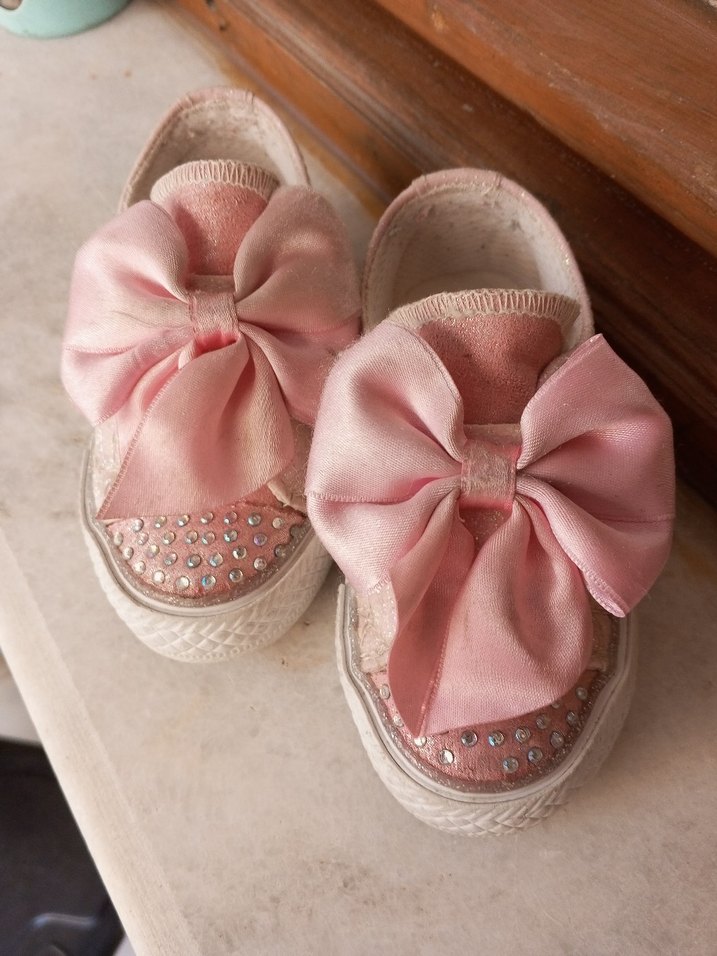 Yumuşak kauçuk materyalden yapılmış, büyük saten fiyonk detaylı pembe kız çocuk ayakkabısı. Burun kısmında hafif parlak süslemeler bulunur.