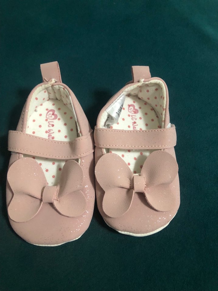 Kız çocukları için pastel pembe renkte, lastik tabanlı, önünde fiyonklu babetler. Düz ve deseniz, bantlı tasarıma sahiptir.