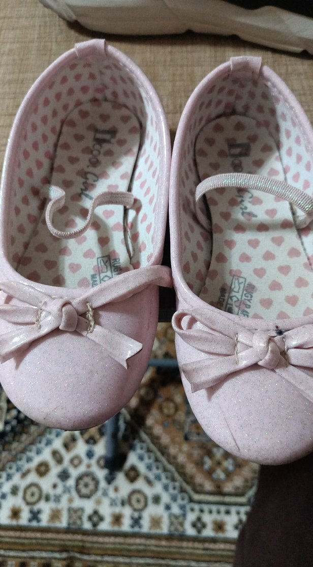 Kız çocukları için pastel pembe renkte, fiyonklu ve kauçuk malzemeden yapılmış babet. İç kısmı kalp desenlidir.
