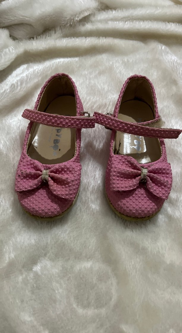 Kız çocukları için pembe renkte, fiyonklu ve pastel yılan derisi desenli kauçuk babetler.