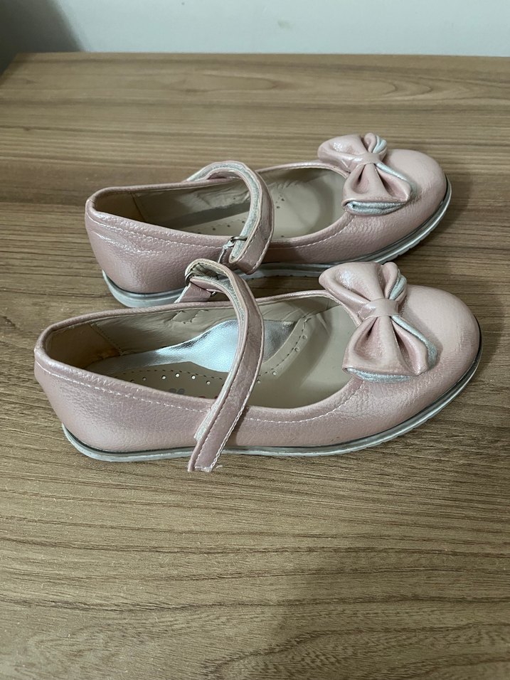 Kız çocukları için pastel pembe renkte, fiyonklu babet ayakkabı. Kauçuk malzemeden üretilmiş, modern klasik tarzda, ortopedik, sadece 1 kez 3-4 saatliğine giyildi göründüğü gibidir hiçbir sorun kusur yoktur.