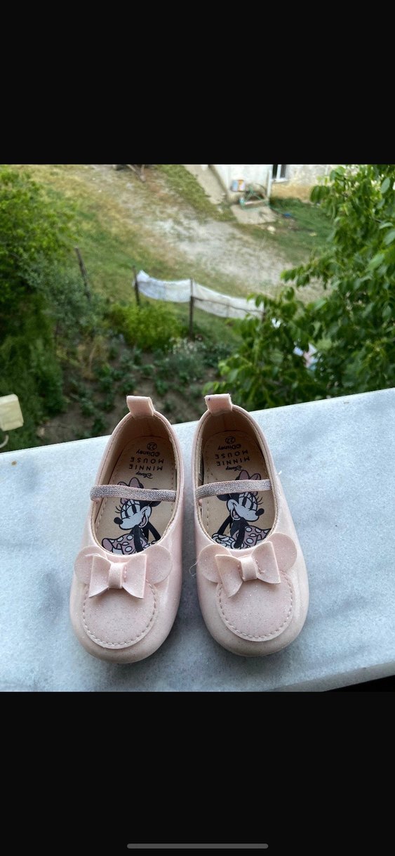Kız çocuklar için fiyonklu, baskılı iç tabanlı, dayanıklı kauçuk malzemeden yapılmış pastel pembe babet ayakkabı.