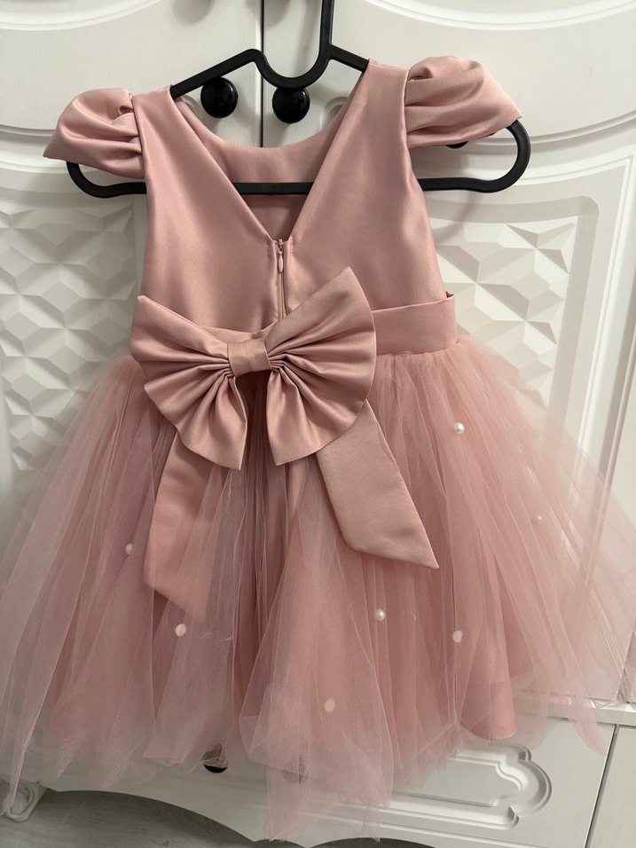 V yaka, ince askılı, belinde büyük fiyonk ve yumuşak katmanlı etek detayları bulunan klasik şıklıkta pembe kız çocuk elbisesi.