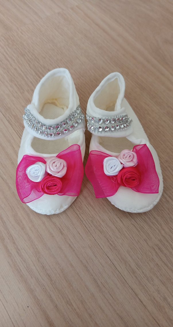 Pembe renkli, örgü detaylı çiçek işlemeli ve fiyonklu kız çocuk ayakkabısı. Yumuşak kauçuk tabanlı, sade tasarımlı özel gün ayakkabısı.