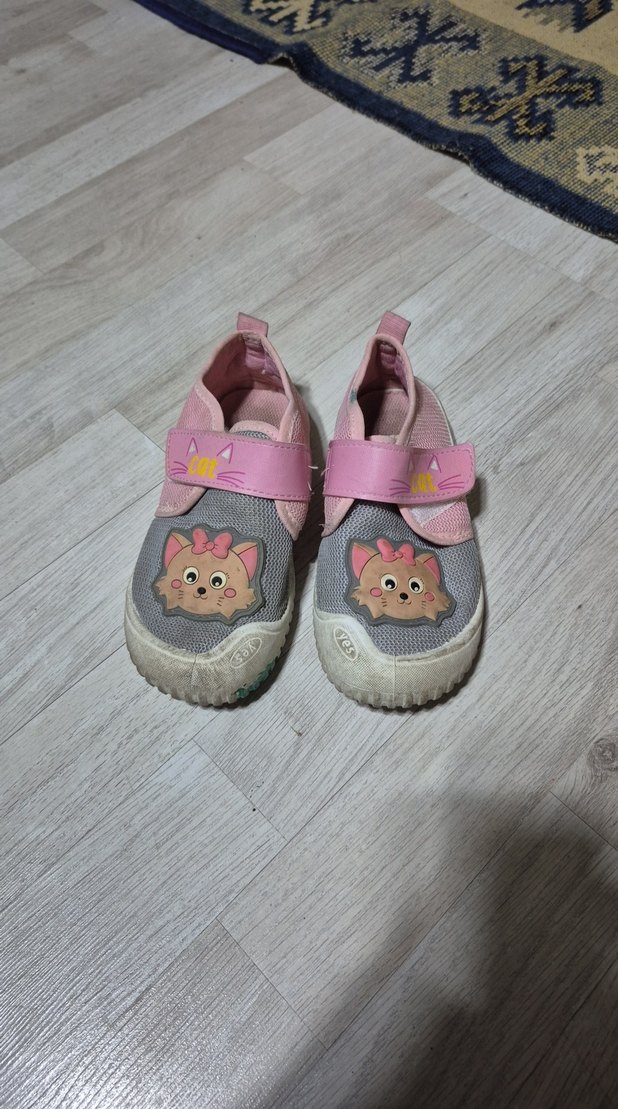 Kız çocukları için pembe ve gri renkli, baskılı desenli spor ayakkabılar. Kauçuk tabanlı ve kolay giyilmesi için cırt cırtlı bantlı.