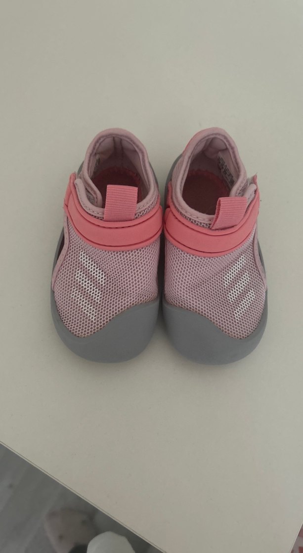 Pembe ve gri renklerde, cırt cırtlı bantlı ve kauçuk tabanlı kız çocuk terliği, rahat ve gündelik kullanım için uygundur.