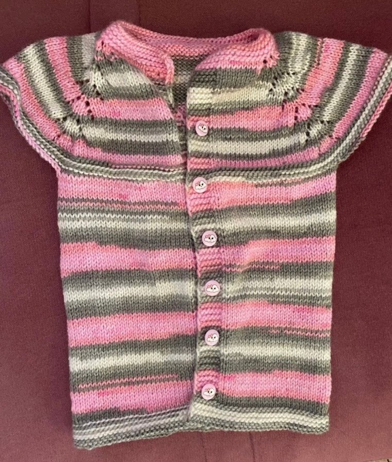 Kız çocuk için pembe ve gri çizgili, uzun kollu, fitted tarzda örgü hırka. Düğmeli ve yumuşak dokuludur.