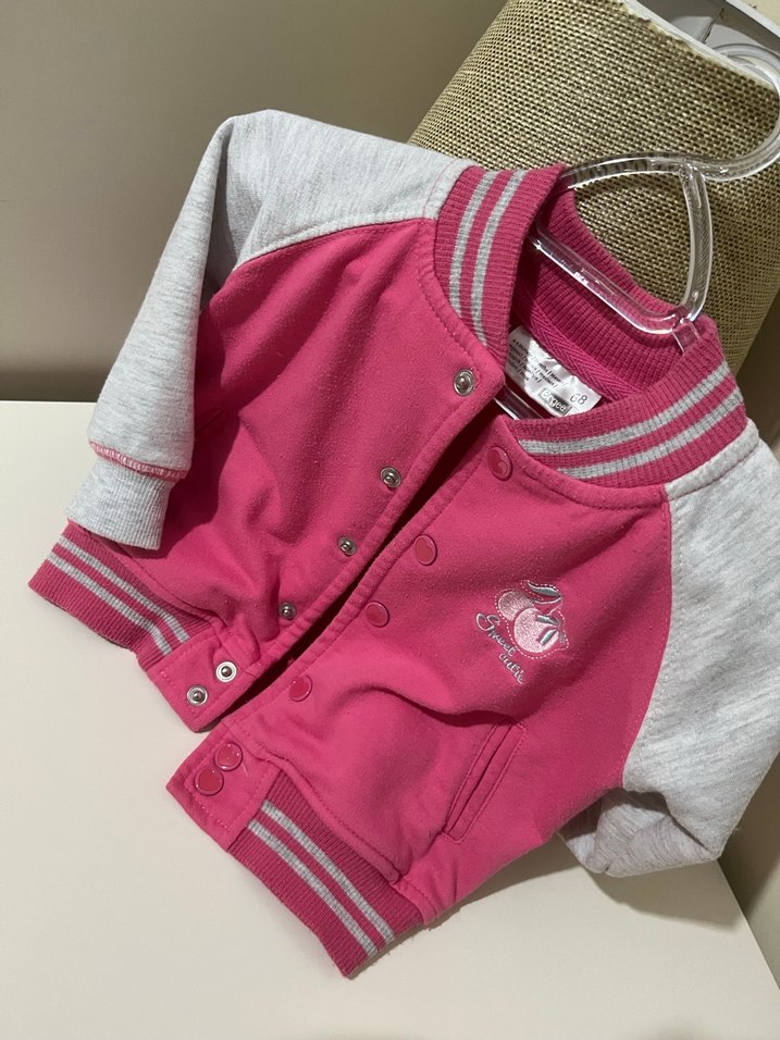 Düğmeli, uzun kollu ve baskılı desenli kız çocuk sweatshirti, pembe ve gri renk kombinasyonuyla sokak tarzı sunar.