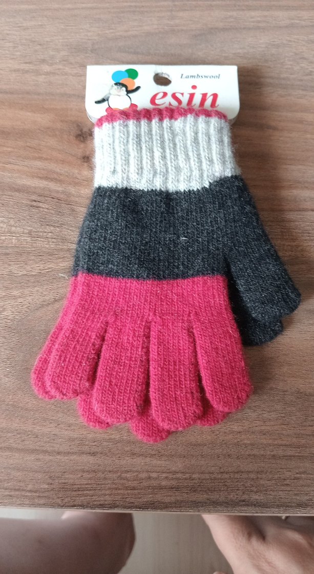 Pembe, gri ve beyaz renklerde kız çocukları için örgü eldiven. Yumuşak örme kumaştan yapılmış, sade ve desensiz tasarım.