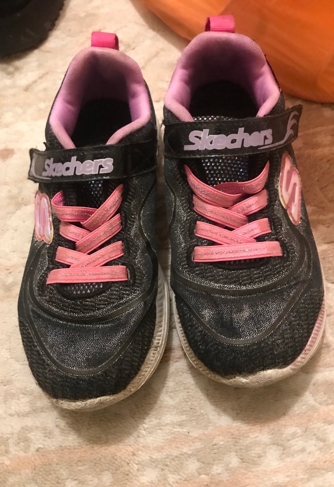 Kız çocuk spor ayakkabıları, cırt cırtlı ve pembe bağcıklı, gri ve pembe renklerde. Kauçuk tabanlı ve Skechers markalı sokak stili ayakkabı.