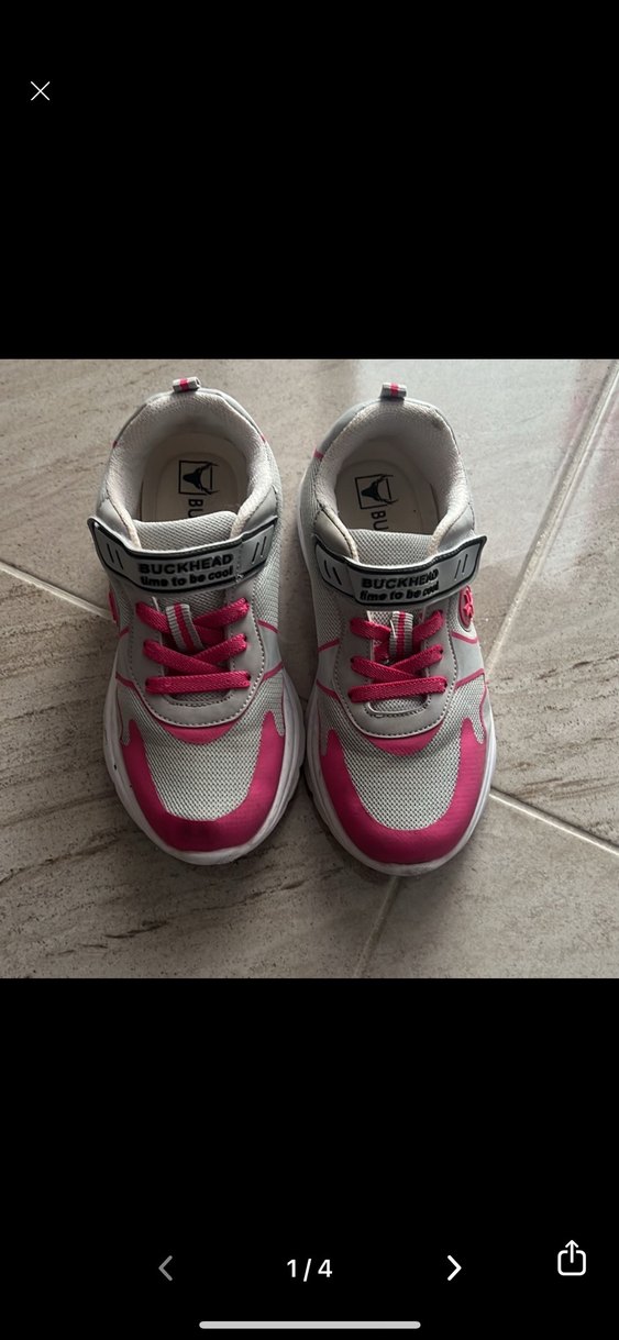 Pembe ve gri renklerde, baskılı detaylı kız çocuk spor ayakkabısı. Velcro kapamalı, rahat kauçuk tabanlı, trend sokak stili için uygun.