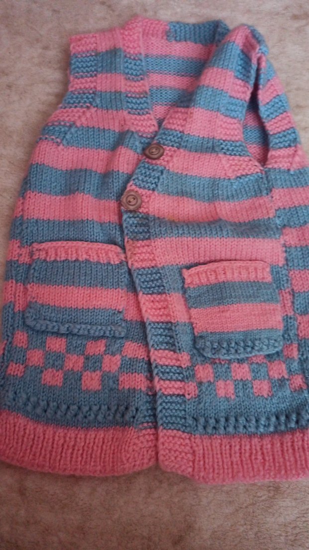Fitted kesim, kolsuz, yakası kesik yaka olan bu kız çocuk yeleği, yumuşak triko kumaştan yapılmıştır. Pastel pembe ve gri çizgiler, ön cepler ve düğme detayları bulunur. el örgüsüdür