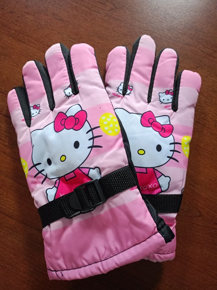 Renkli Hello Kitty baskılı, cırtcırtlı, biker tarzı kız çocuk pembe eldiven. Yumuşak ve sıcak kumaş.