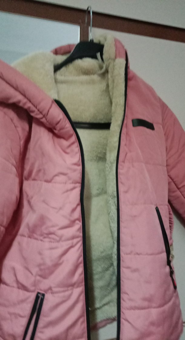 Kadınlar için yumuşak pembe renkte, kürk detaylı, kesik yakalı, uzun kollu, midi boyda, rahat ve şık sokak stili kışlık mont. ❄️Kücük geldiği için bir kaç kez gîydi