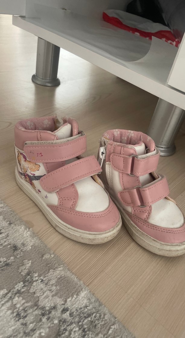 Pembe renkli, lastik malzemeden yapılmış, baskılı detaylı kız çocuk için sokak stili ilk adım ayakkabısı. Tokalı kayışları vardır.