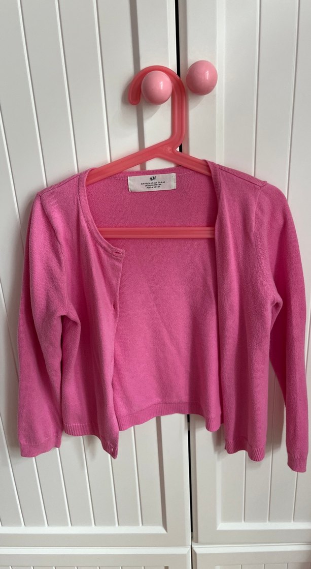 Uzun kollu, ince triko dokulu pembe hırka, yumuşak ve sıcak kumaştan, sade tasarımlı.
