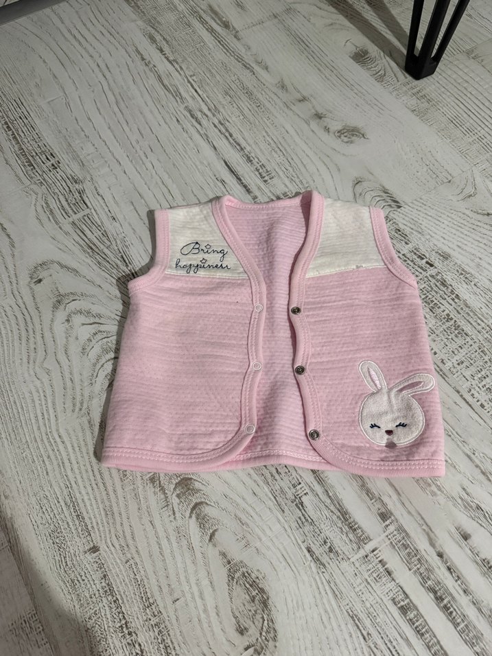 Kız bebekler için pembe renkli, işlemeli yelek. Tavşan figürü ve yazı detaylı, salaş kesim, bisiklet yaka ve kolsuz tasarıma sahip.