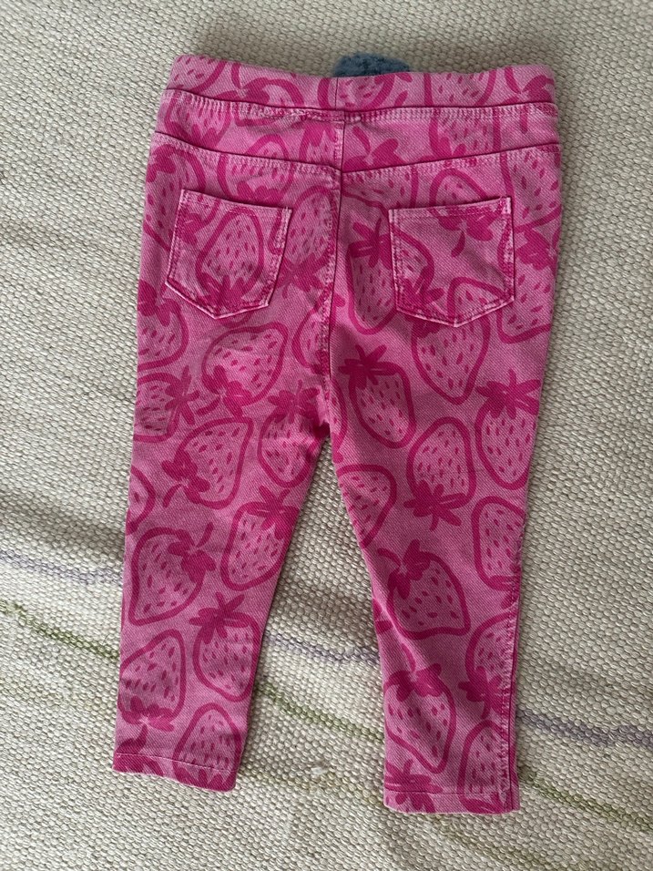 Sentetik kumaştan, düğmeli, renkli çilek desenli, dar kesim pembe kız çocuk taytı.